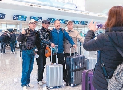 2月8日,前往印尼巴厘島的旅行團(tuán)游客在浙江杭州蕭山國(guó)際機(jī)場(chǎng)T4航站樓拍照留念。 龍 巍攝(人民圖片)