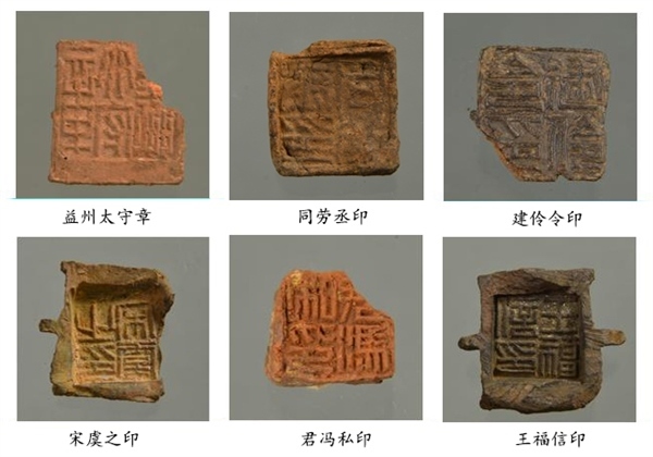 封泥集中出土于北部發(fā)掘區(qū)東北角的河道廢棄堆積中,共計(jì)837枚。主要為官印封泥和私印封泥,其中官印封泥有“益州太守章”“建伶令印”“同勞示印”等,涵蓋了漢代益州郡 24 縣中的20個(gè)縣名。出土帶字簡(jiǎn)牘殘片 1000 余枚,不帶字的簡(jiǎn)牘殘片近萬(wàn)枚。其中,帶字簡(jiǎn)牘中釋讀出“滇池以亭行”“建伶”“始元四年”等文字,應(yīng)是公文文書(shū)。