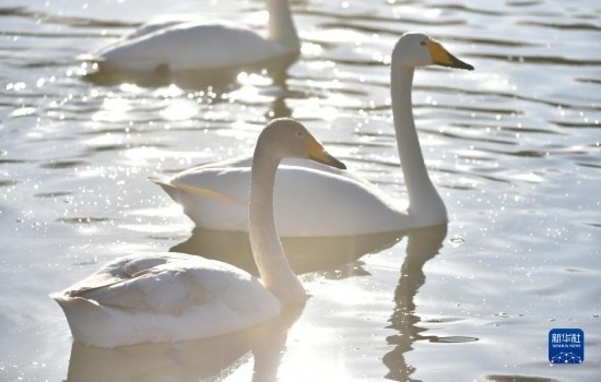入冬以來,遼寧省北票市八家子鄉(xiāng)紅村大凌河畔的400多只白天鵝在河水淺灘處嬉戲覓食,吸引人們前來觀賞和拍照。