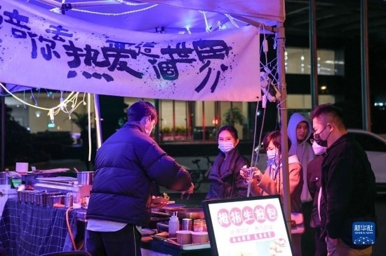 在四川省成都市錦江區(qū)三色路夜市,市民在購(gòu)買(mǎi)小吃(2月28日攝)。