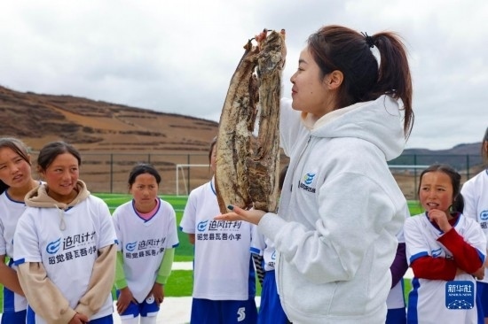 圖為四川籍的中國女足國腳萬佳瑤(前)獲贈瓦吾小學(xué)女足球隊員從家里帶來的臘肉(2023年3月3日攝)。