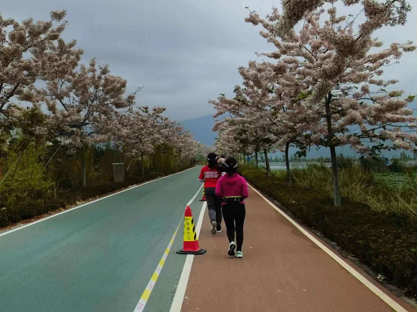 人民網(wǎng)黨委委員、監(jiān)事會(huì)主席唐維紅參加了此次半程馬拉松。完賽后,她總結(jié)此賽事的特點(diǎn)有“三美”——美在賽道。湖靜謐、山秀美,粉的神黃豆花、紅的三角梅、藍(lán)的百子蓮、藍(lán)花楹……爭(zhēng)相斗艷,跑在山水間,一步一風(fēng)景!
