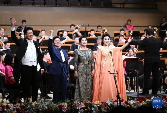 5月25日,在天津大劇院音樂廳,歌唱家王澤南(左一)、王宏偉(左二)、關(guān)牧村(左三)、張晏蓉等在舞臺(tái)上演出。