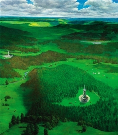 河北塞罕壩林場,是“三北”工程建設(shè)的重要區(qū)域?;脑兞趾5娜眽纹孥E,成為近年來主題性美術(shù)創(chuàng)作的重要課題。入選“筑夢——我們的新時代美術(shù)攝影作品展”的譚智群油畫《美麗的塞罕壩》,是在實地寫生基礎(chǔ)上的藝術(shù)提煉和情感升華。作者以俯視的構(gòu)圖,鋪展?jié)M目蒼翠的美景。畫面左側(cè),清澈的河流蜿蜒向前;畫面右側(cè),白色的雁群逐綠翱翔;遠方,茂密的森林不斷延伸,風(fēng)力發(fā)電機林立于山巔,畫面充滿生機與活力。同樣以俯視的角度處理構(gòu)圖,孔亮油畫《美麗中國——塞罕壩》則以塞罕壩林場和塞罕塔為視覺中心,蔥蘢的綠意,將意境渲染得更加深邃。翁凱旋油畫《滄海桑田——塞罕壩的前世今生》,通過三聯(lián)畫的形式,在新舊對比中構(gòu)建時空長廊,描繪出塞罕壩的時代變遷。