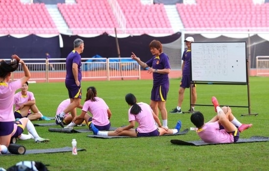 7月5日,中國女足主教練水慶霞(右三)點評訓(xùn)練情況。新華社記者 丁旭 攝