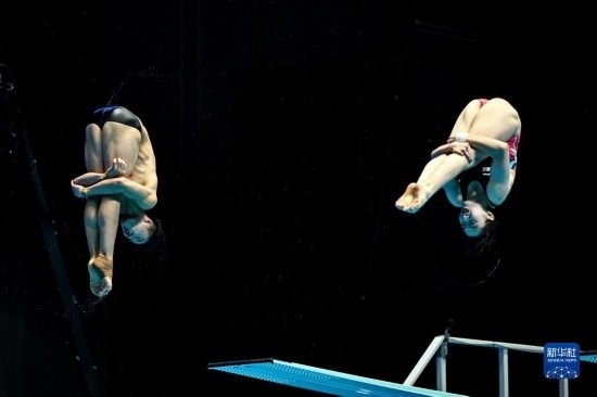 7月18日,中國選手司雅杰(右)/白鈺鳴在混雙三米板比賽中。