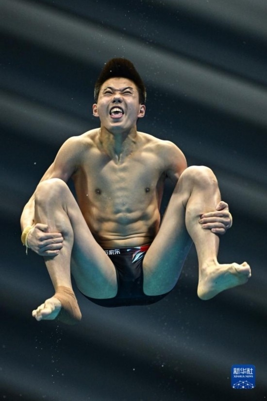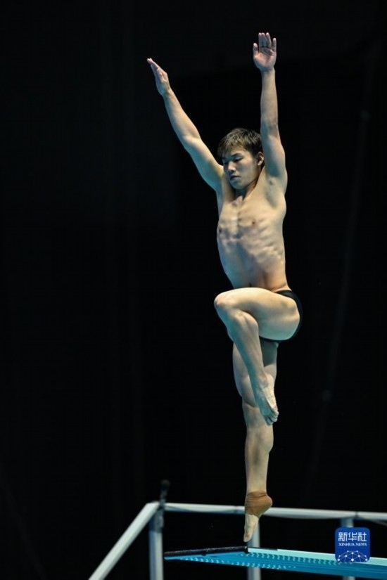 7月18日,中國選手鄭九源在三米板項目比賽中。