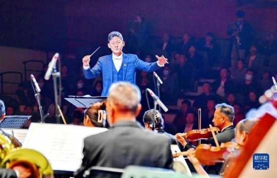 指揮普布次仁指揮樂隊演奏《我的祖國》(7月18日攝)。