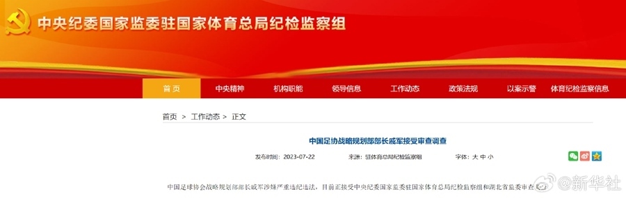 中國足球協(xié)會技術(shù)部部長譚海涉嫌嚴(yán)重違紀(jì)違法,目前正接受中央紀(jì)委國家監(jiān)委駐國家體育總局紀(jì)檢監(jiān)察組和湖北省監(jiān)委審查調(diào)查。中國足球協(xié)會戰(zhàn)略規(guī)劃部部長戚軍涉嫌嚴(yán)重違紀(jì)違法,目前正接受中央紀(jì)委國家監(jiān)委駐國家體育總局紀(jì)檢監(jiān)察組和湖北省監(jiān)委審查調(diào)查。(中央紀(jì)委國家監(jiān)委駐國家體育總局紀(jì)檢監(jiān)察組)