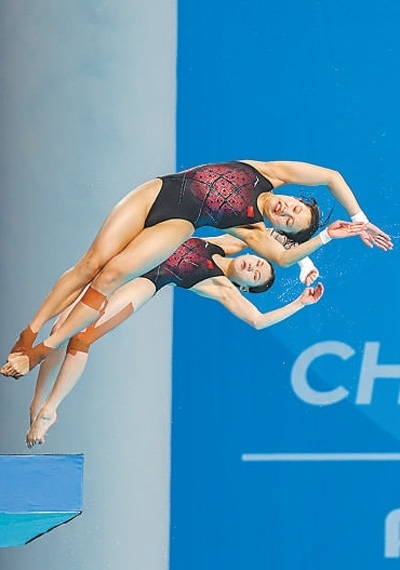 7月31日,中國代表團選手張家齊(后)、掌敏潔在女子雙人10米跳臺決賽中。本報記者 伊 霄攝