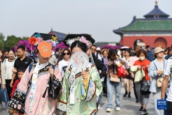 10月2日,游客在天壇公園內(nèi)參觀游覽。
