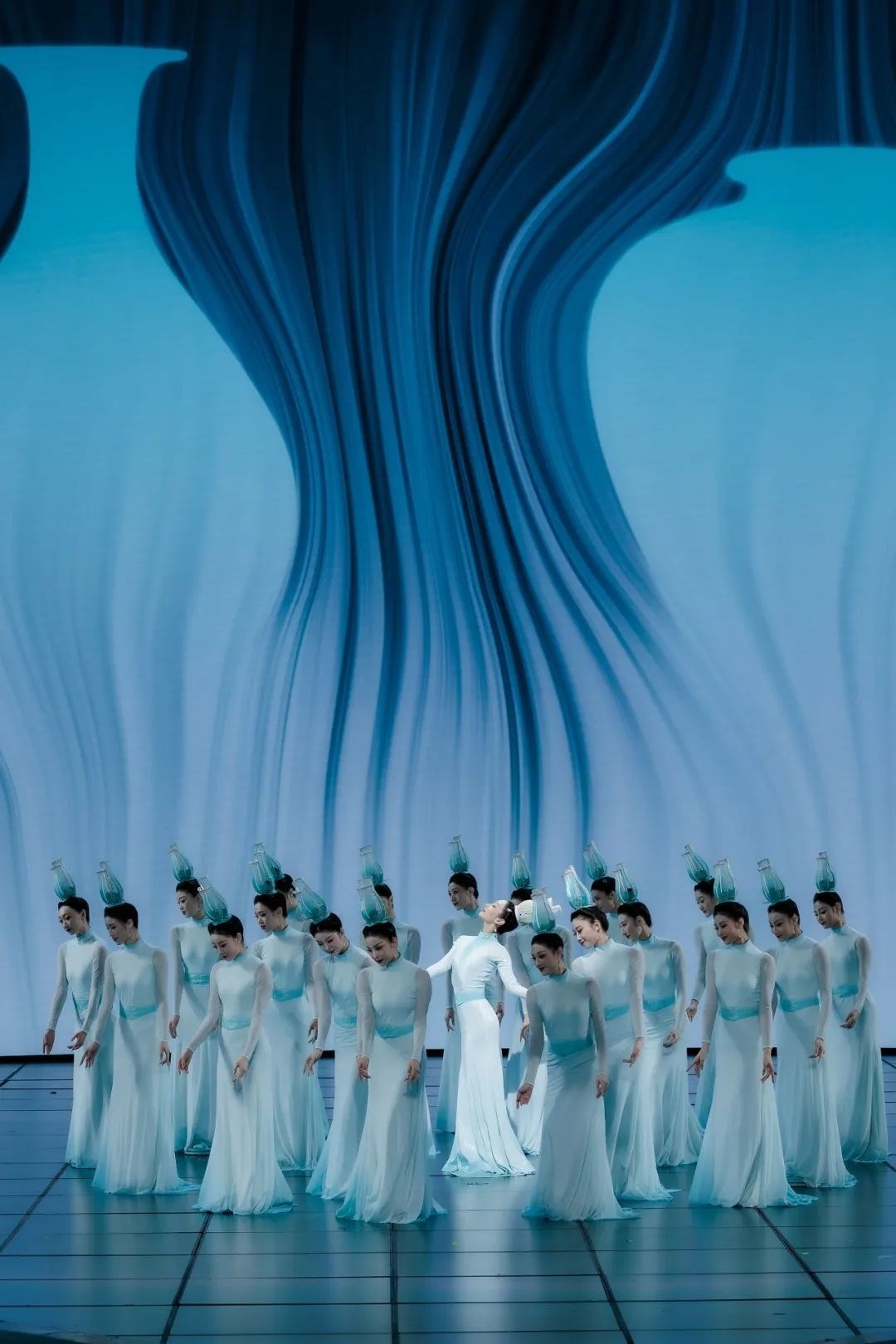 《瓷影》正是以青白瓷為視覺出發(fā)點,演出服裝在色彩上著墨,提取“青”“白”這兩種傳統(tǒng)“正色”,展現(xiàn)出大繁若簡的東方美學(xué)。通過舞者的肢體語言展現(xiàn)青白瓷跨越千年的獨特魅力。