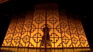 《詠春》來自舞劇《詠春》選段,已經(jīng)上演了百場,但在春晚是個特別的版本。為了創(chuàng)造出更加意蘊豐富的想象空間,總臺臺長慎海雄在推薦這個舞劇片段時,提出了幾個建議,包括演員服裝從黑色的香云紗改為絳紅色,男女主角之間的關(guān)系要從男主角一一過招“大敗”女主角改為相互切磋武藝,開場以男主角的武術(shù)剪影來增強吸引力,通過使用剪影效果來展現(xiàn)“葉問”的出場。當燈光亮起,窗欞上“詠春拳”三個書法大字淡去,“葉問”的剪影如同舞動的水墨畫一般,隨即演員閃身舞出屏風,影子與真身共舞。由虛入實,由平面到立體,“剪影”的設(shè)計讓短短半分鐘的獨舞大大增加了層次感和觀賞性,為空曠的舞臺創(chuàng)造出一個“頂天立地”的葉問之影,視覺震撼瞬間放大,堪稱畫龍點睛之筆。