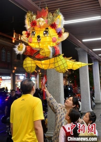 圖為2月20日晚,家長帶著小孩在泉州中山路賞燈。中新網(wǎng)記者 張斌 攝