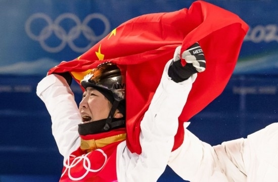 2022年2月14日,北京冬奧會(huì)自由式滑雪女子空中技巧決賽在張家口云頂滑雪公園舉行。中國選手徐夢(mèng)桃在奪冠后慶祝。新華社記者 肖藝九 攝