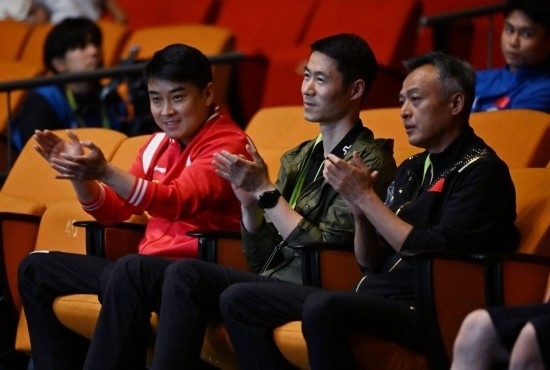 2023年5月26日,中國乒乓球協(xié)會(huì)副主席王勵(lì)勤(中)在南非德班進(jìn)行的2023年世界乒乓球錦標(biāo)賽男子單打四分之一決賽中觀戰(zhàn)。新華社記者 陶希夷 攝