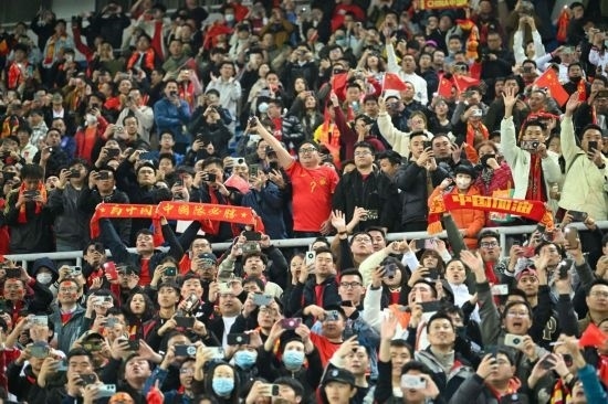 據(jù)主辦方介紹,天津奧體中心體育場的球票基本銷售一空,有42977名觀眾到場為中國隊助威。比賽在晚上8點(diǎn)開球,結(jié)束已是10點(diǎn)左右。初春夜晚加之冷風(fēng),寒意十足,但球迷的熱情和助威貫穿全程。