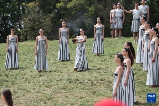 當(dāng)?shù)貢r(shí)間12時(shí)16分,在有2500多年歷史的赫拉神廟遺址前,由希臘女演員瑪麗·米娜扮演的古希臘女祭司向光明之神阿波羅祈禱后點(diǎn)燃了火種。由于現(xiàn)場(chǎng)多云,火種點(diǎn)燃環(huán)節(jié)沒(méi)有采用傳統(tǒng)的凹面鏡取火,而是選用了此前備用的火種。