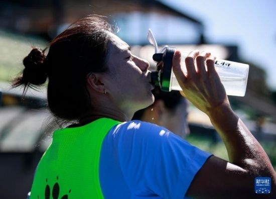 4月26日,中國女曲隊球員谷丙鳳在集訓(xùn)間隙補(bǔ)充水分。新華社記者 馬平 攝