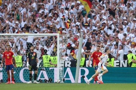 久攻之下,德國(guó)隊(duì)終于在第89分鐘扳平比分,米特爾施泰特左路傳中,基米希頭球回?cái)[,維爾茨抽射入網(wǎng)。兩隊(duì)在常規(guī)時(shí)間1:1戰(zhàn)平,比賽進(jìn)入加時(shí)賽。第106分鐘,德國(guó)隊(duì)穆夏拉射門擊中西班牙隊(duì)庫(kù)庫(kù)雷利亞手臂,后者當(dāng)時(shí)在本方禁區(qū)內(nèi)防守,但主裁判并沒有判罰點(diǎn)球,VAR(視頻助理裁判)也沒有介入。