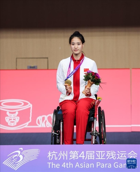 圖為2023年10月23日,中國選手辜海燕在杭州第4屆亞殘運會輪椅擊劍項目女子花劍個人頒獎儀式上。新華社記者 胡星宇 攝