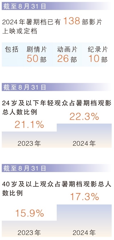 根據(jù)國家電影局統(tǒng)計,2024年中國電影暑期檔(6月1日—8月31日)全國電影票房為116.43億元,觀影人次為2.85億,國產(chǎn)影片票房為84.81億元,占比為72.84%。2024年暑期檔上映、定檔百余部影片,既有國產(chǎn)片也有進口片,涵蓋劇情片、動畫片、紀錄片等,題材、類型、樣式、風格多樣,開拓了審美空間,力圖滿足不同年齡、不同地域、不同性別觀眾的多樣化觀影需求。