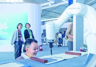 觀眾在參觀第七屆世界聲博會(huì)上的一款文藝創(chuàng)作機(jī)器人。新華社記者 傅天攝
