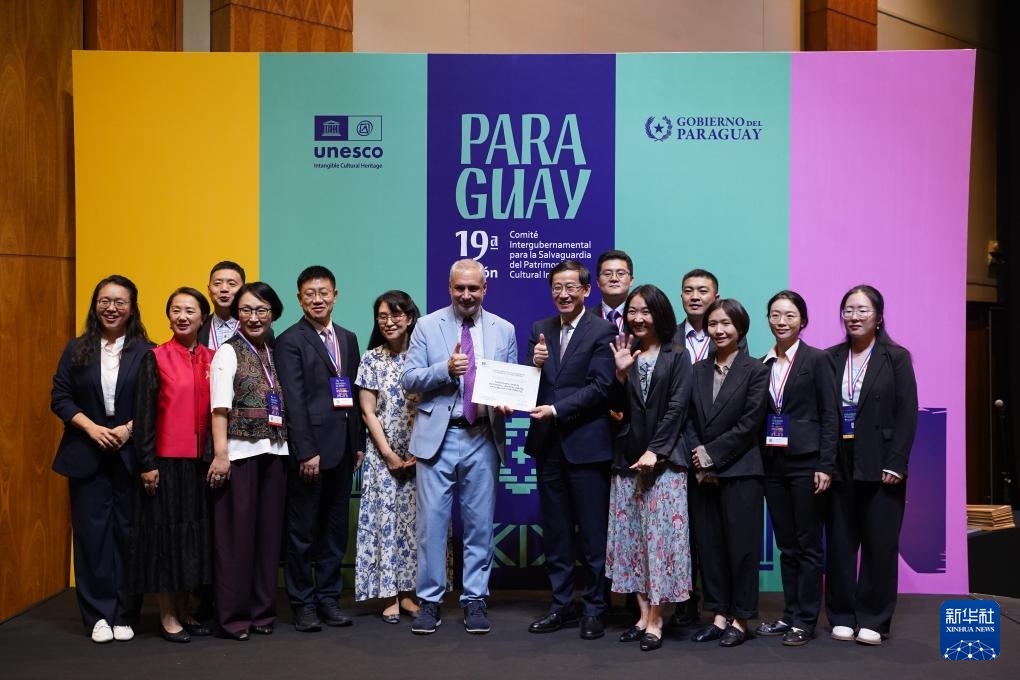 12月5日,在巴拉圭亞松森舉行的聯(lián)合國(guó)教科文組織保護(hù)非物質(zhì)文化遺產(chǎn)政府間委員會(huì)第19屆常會(huì)現(xiàn)場(chǎng),中國(guó)代表上臺(tái)領(lǐng)取證書(shū)。新華社記者 朱雨博 攝