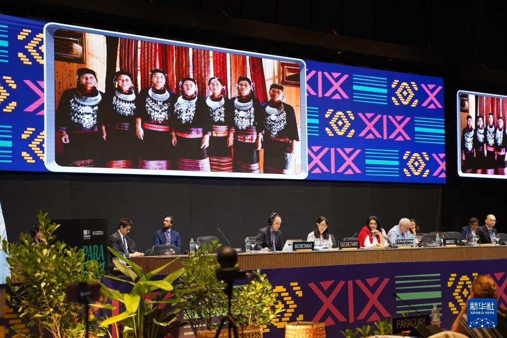 12月5日,在巴拉圭亞松森聯(lián)合國(guó)教科文組織保護(hù)非物質(zhì)文化遺產(chǎn)政府間委員會(huì)第19屆常會(huì)評(píng)審現(xiàn)場(chǎng),大屏幕播放“黎族傳統(tǒng)紡染織繡技藝”宣傳視頻。新華社記者 朱雨博 攝