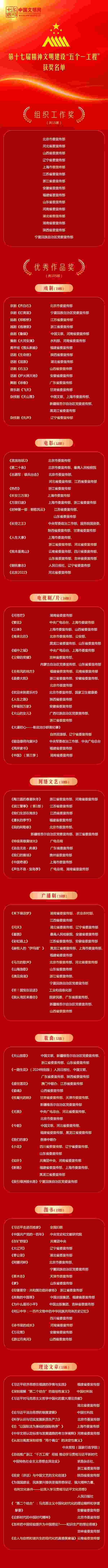 近日,中共中央宣傳部印發(fā)表彰決定,對第十七屆精神文明建設“五個一工程”組織工作先進單位和優(yōu)秀作品進行表彰。授予《齊白石》等15部戲劇作品、《流浪地球2》等12部電影作品、《問蒼茫》等16部電視作品、《陶三圓的春夏秋冬》等10部網(wǎng)絡文藝作品、《禾下乘涼夢》等10部廣播劇、《天山放歌》等12首歌曲,共105部作品“優(yōu)秀作品獎”;授予北京、河北、山西、遼寧、上海、江蘇、浙江、安徽、福建、山東、河南、湖北、湖南、陜西、寧夏等15個省區(qū)市黨委宣傳部“組織工作獎”。