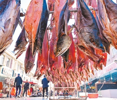 “我一米八,這條大馬哈魚豎起來(lái)跟我一般高!”廣西游客陳希在魚市逛得起勁,挑選了好幾條塑封好的熏魚,“中午我吃的就是全魚宴,這里的冷水魚非常細(xì)嫩,肉質(zhì)緊實(shí),我準(zhǔn)備再買些帶回家鄉(xiāng)?!?/p>