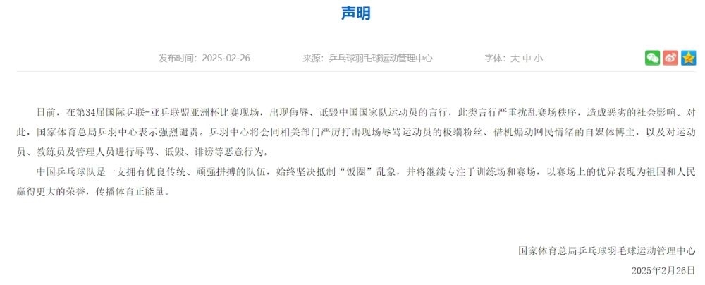 國(guó)家體育總局乒乓球羽毛球運(yùn)動(dòng)管理中心26日發(fā)布聲明,強(qiáng)烈譴責(zé)嚴(yán)重?cái)_亂第34屆國(guó)際乒聯(lián)-亞乒聯(lián)盟亞洲杯賽場(chǎng)秩序、造成惡劣社會(huì)影響的行為,并將會(huì)同相關(guān)部門進(jìn)行嚴(yán)厲打擊。
