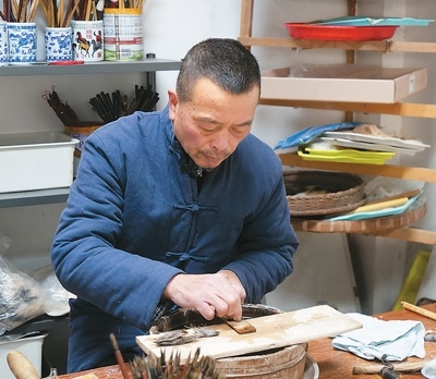 把毛料放在水中仔細(xì)清洗,就著燈光剔除一根根細(xì)微雜毛,將清理后的毛料聚合成圓直光滑、攏抱不散的錐形……走進(jìn)涇縣涇川鎮(zhèn)宣筆制作技藝代表性傳承人佘征軍的工作室,他正在為一支紫毫筆制作筆頭?!鞍拙右子性?shī)云,‘宣城之人采為筆,千萬(wàn)毛中揀一毫’。此句講的是宣筆制作工藝的復(fù)雜精細(xì)?!辟苷鬈娬f(shuō)。
