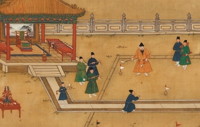 捶者,打也;丸者,球也?!安簧賹W(xué)生剛接觸捶丸時,說它像現(xiàn)代的高爾夫。其實(shí),捶丸比高爾夫運(yùn)動歷史更悠久?!逼巾斏綄W(xué)院陶瓷學(xué)院院長梅國建介紹,捶丸源自唐代擊鞠(馬球)和步打球,傳至宋朝逐漸演變?yōu)橐来螕羟虻姆菍剐员荣?,名稱也變?yōu)榇吠?,現(xiàn)藏于故宮博物院的《明宣宗行樂圖》中就描繪了宮中捶丸的場景。