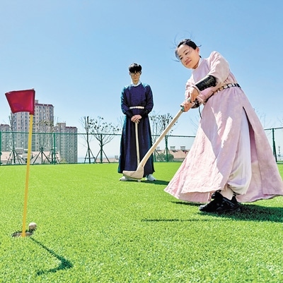 瞄球、揮擊,隨著一聲清脆的擊打聲,陶瓷小球劃出優(yōu)美的弧線,停到插有旗桿的“球窩”附近。春日遲遲,在河南省平頂山學(xué)院捶丸球場,一群學(xué)生身著漢服或運(yùn)動服飾,借助形狀各異、長短不一的球杖,對草坪上的陶瓷球進(jìn)行輪番擊打。