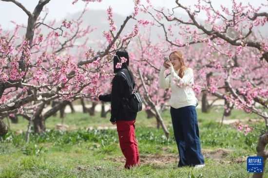 4月19日,游客在蘭州市安寧區(qū)一處桃園賞花拍照。