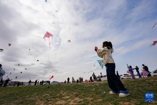 4月19日,人們在新疆烏魯木齊市水磨溝區(qū)風箏嘉年華活動現(xiàn)場放風箏。