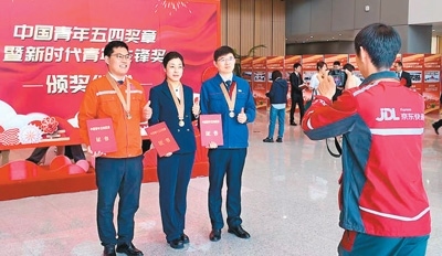 2025年4月30日,中國青年五四獎(jiǎng)?wù)卖咝聲r(shí)代青年先鋒獎(jiǎng)?lì)C獎(jiǎng)儀式在京舉行。趙亞杰(中)在頒獎(jiǎng)現(xiàn)場合影留念,拍攝照片的是快遞小哥欒玉帥,他也獲得了2025年度中國青年五四獎(jiǎng)?wù)隆?/p>