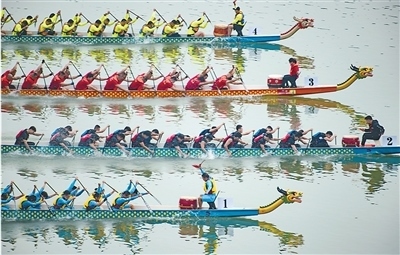 “比賽項(xiàng)目很豐富,有200米、500米直道賽以及搶紅奪標(biāo)賽,今年還新設(shè)了龍舟拔河?!惫ふf,傳統(tǒng)的龍舟一般坐22個(gè)人,現(xiàn)在比賽用的小龍舟通常坐12個(gè)人。