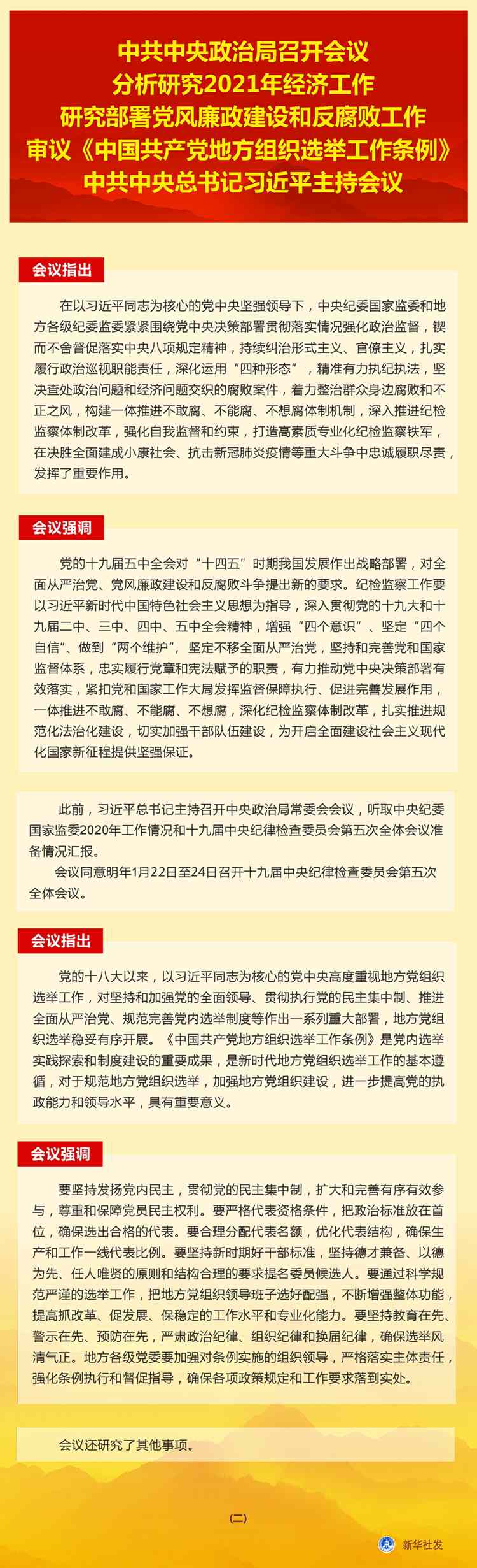 新華社北京12月11日電 中共中央政治局12月11日召開會議,分析研究2021年經濟工作;聽取中央紀委國家監(jiān)委工作匯報,研究部署2021年黨風廉政建設和反腐敗工作;審議《中國共產黨地方組織選舉工作條例》。中共中央總書記習近平主持會議。