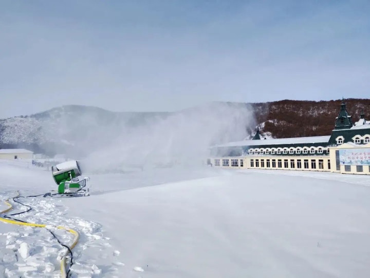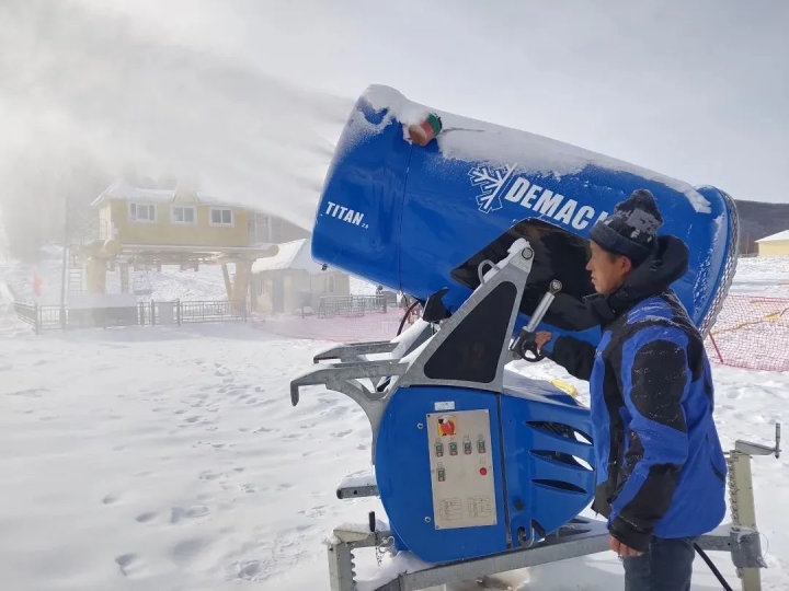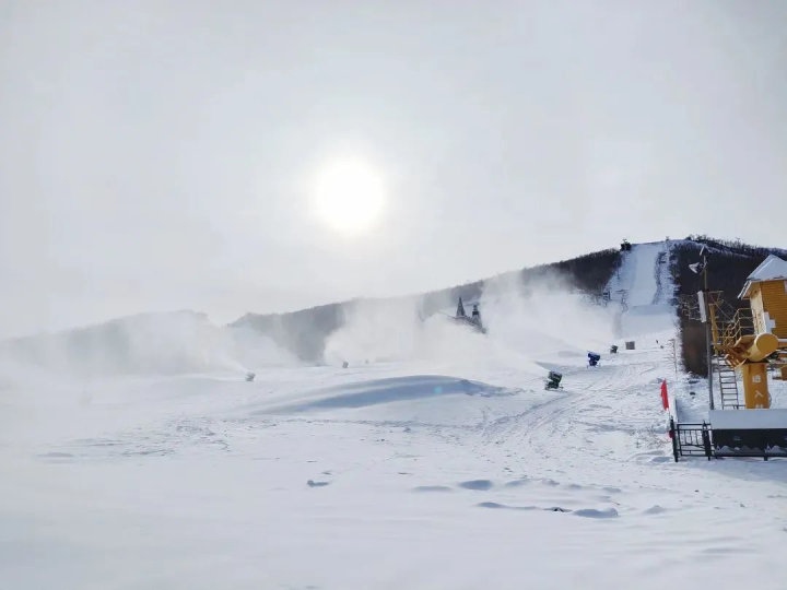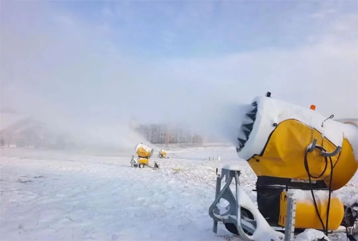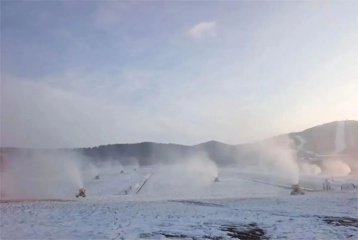 位于赤峰市喀喇沁旗的美林谷滑雪場在11月6日下午3點(diǎn)開機(jī)造雪,共布造雪機(jī)40臺。從炮筒周圈噴出的水霧,在雪炮扇葉攪動的大風(fēng)加持下立刻凝結(jié)成雪霧和冰霜,被吹到7-8米遠(yuǎn)的地上,只過了不到半分鐘,雪炮正前方就凝結(jié)出了一條潔白的雪道。美林谷滑雪場“十四冬”賽道長550米,寬55米,造雪厚度1米,造雪工作將根據(jù)氣候濕度等條件進(jìn)行相應(yīng)調(diào)整,預(yù)計(jì)造雪時間為45至48天,12月中旬將造完40萬平方米雪。
