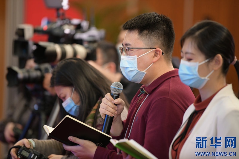 媒體記者在“代表通道”上提問。新華網 曹楨攝