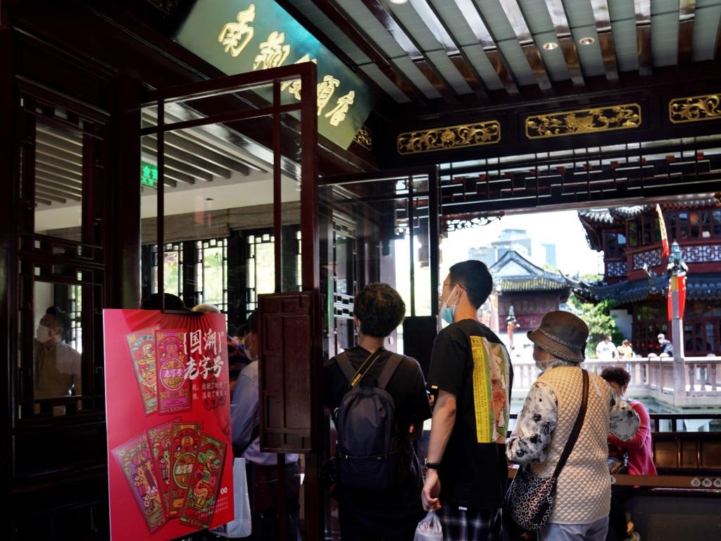 2020年5月12日,在上海豫園南翔饅頭店門口,消費者從“國潮”廣告牌旁經(jīng)過。新華社記者 劉穎 攝
