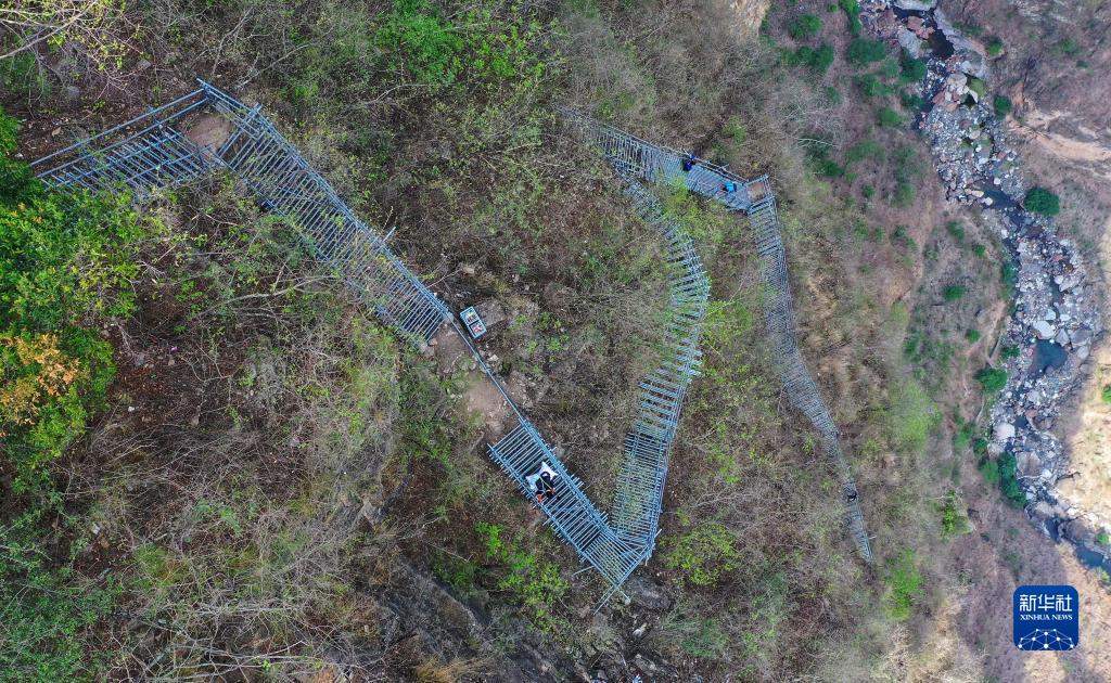 在四川涼山彝族自治州昭覺(jué)縣阿土列爾村的懸崖鋼梯上,“懸崖村”村民沿著鋼梯下山(2020年5月13日攝,無(wú)人機(jī)照片)。新華社記者 王曦 攝