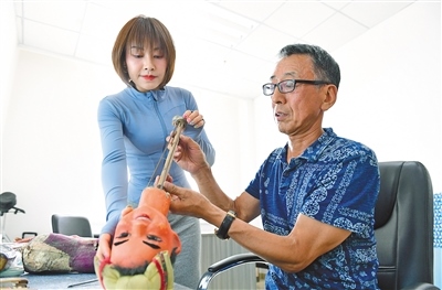 靳媛在原呼和浩特市玉泉區(qū)木偶劇團(tuán)演員張曉紅(右)指導(dǎo)下修復(fù)木偶。