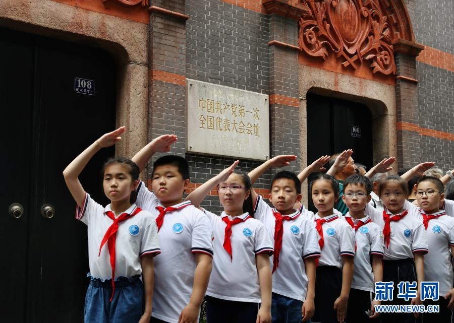 在中共一大會(huì)址前,上海市復(fù)旦萬(wàn)科實(shí)驗(yàn)學(xué)校的少先隊(duì)員們?cè)趨⒂^后合影留念(2019年6月27日攝)。新華社記者 劉穎 攝