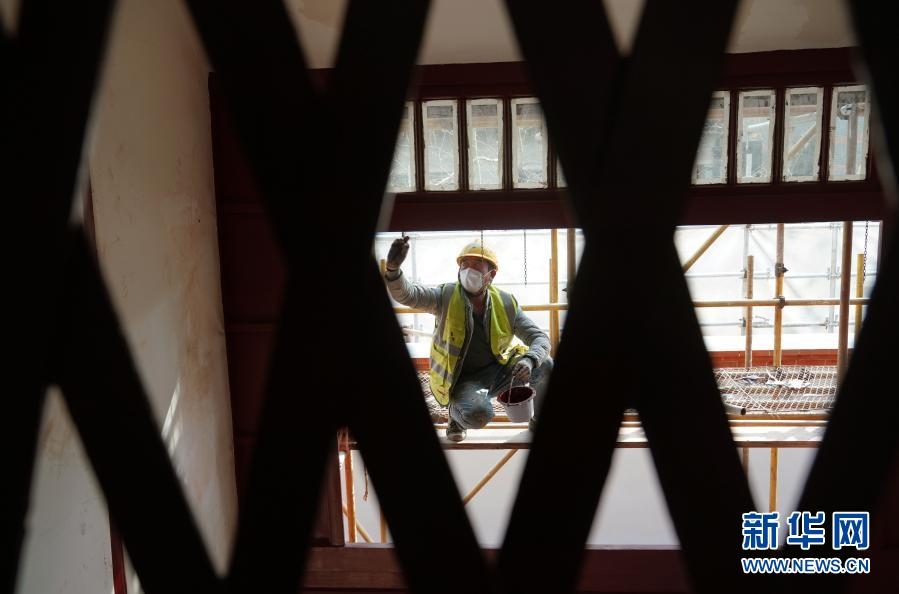 2021年1月14日,工人在修繕現(xiàn)場(chǎng)施工。2020年11月17日起,中共一大會(huì)址及原展廳暫停對(duì)外開(kāi)放實(shí)施修繕改造。新華社記者 劉穎 攝