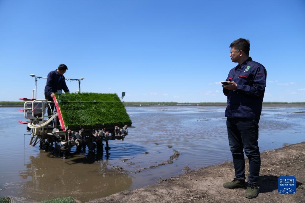 陸向?qū)?右)用手機操控帶有北斗導(dǎo)航系統(tǒng)的插秧機(5月18日攝)。新華社記者 王建威 攝