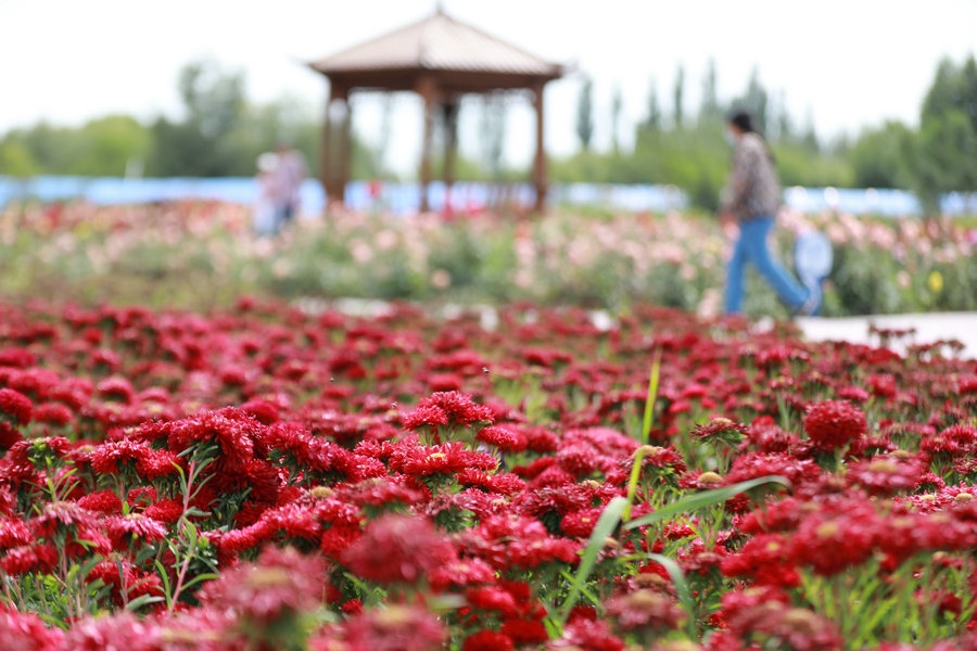 9月5日,游人在呼和浩特南湖濕地公園內(nèi)賞花。